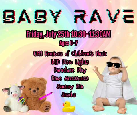 Enjoy classic kids songs turned into EDM and Techno music as well as movement-based dance songs. In rave fashion, there will be dance scarves, a disco ball, glowsticks, snacks and, of course, music! Take this time to have your little one move and groove and burn off that extra energy!