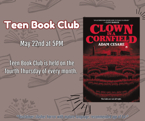 Teen Book Club is hosted on the fourth Thursday of every month (excluding holidays). Join us for a lively discussion of Clown in a Cornfield by Adam Cesare. We have a prepared list of questions, opinions, and random factoids, but feel free to prep your own questions and opinions of this month's book. We will vote on next month's read at the end of the meeting.