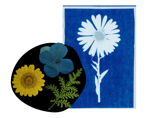 Make a print with dried flowers, buttons, cut paper, other ephemera, and a little help from the sun!