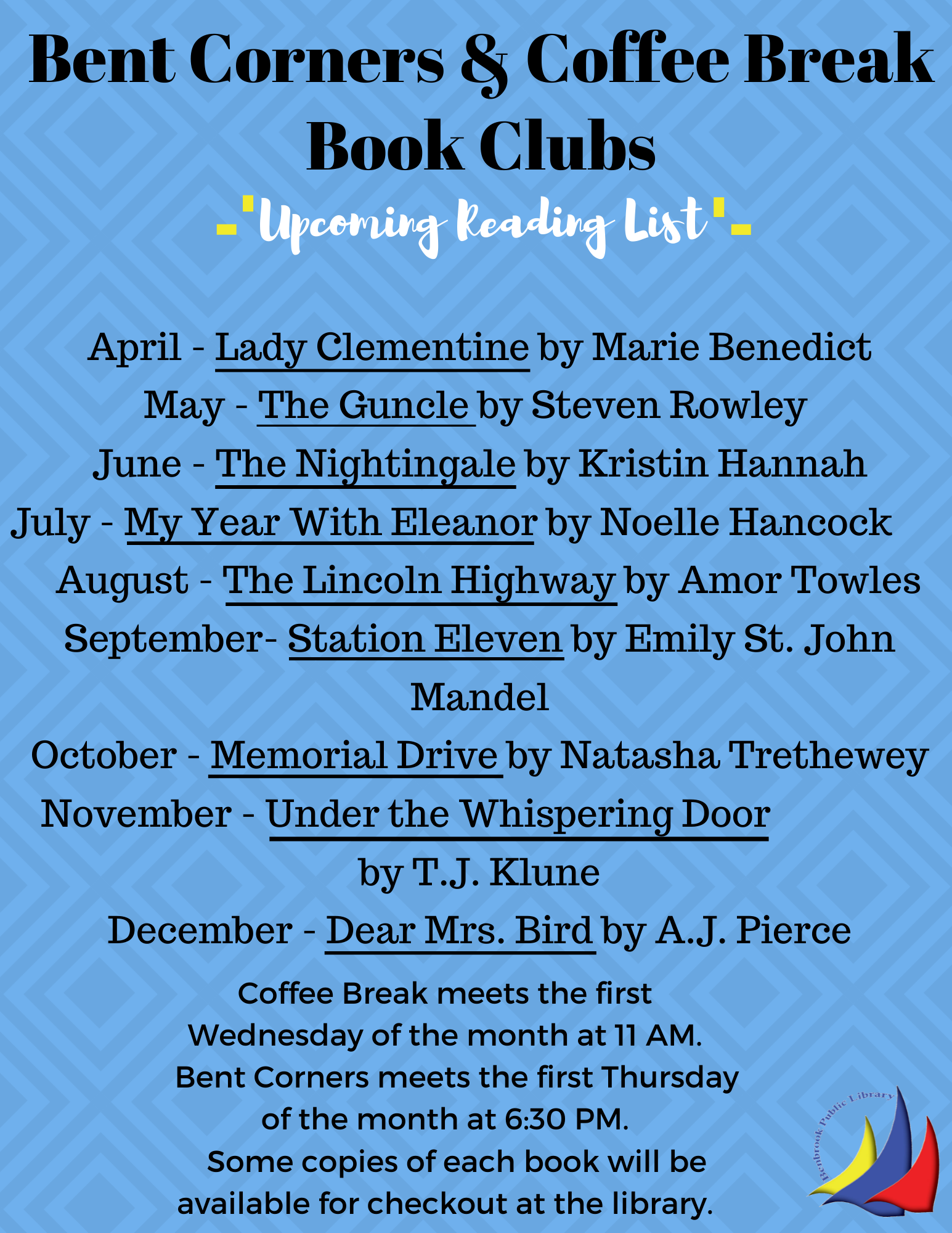 This event is in the "Adults" group Bent Corners Book Club 6:30pm–8:00pm Adults Book Club, Hybrid This event is in the "Adults" group Sep 1 2022 Thu Bent Corners Book Club 6:30pm–8:00pm Book Club, Hybrid Please note you are looking at an event that has already happened. Library Branch: Benbrook Public Library Age Group: Adults Program Type: Book Club, Hybrid Event Details: Bent Corners The only thing better than reading a good book is reading a good book and then talking about it with fellow book lovers. Every month we read a preselected book and then meet to discuss it. The Adult Services Librarian guides the discussion, but attendees are encouraged to bring up their own desired topics for the group to talk about, and we like to keep it loose and let the conversation flow naturally.The book club reads primarily fiction titles, but we change things up with a non-fiction title from time to time. Click here to view the current reading list. Disclaimer(s) Photo Permission Staff often take pictures during library programs. The library uses photos in its publicity, in social media, and on its website. If you do not want your photo used, please contact the library and the library will honor that request.
