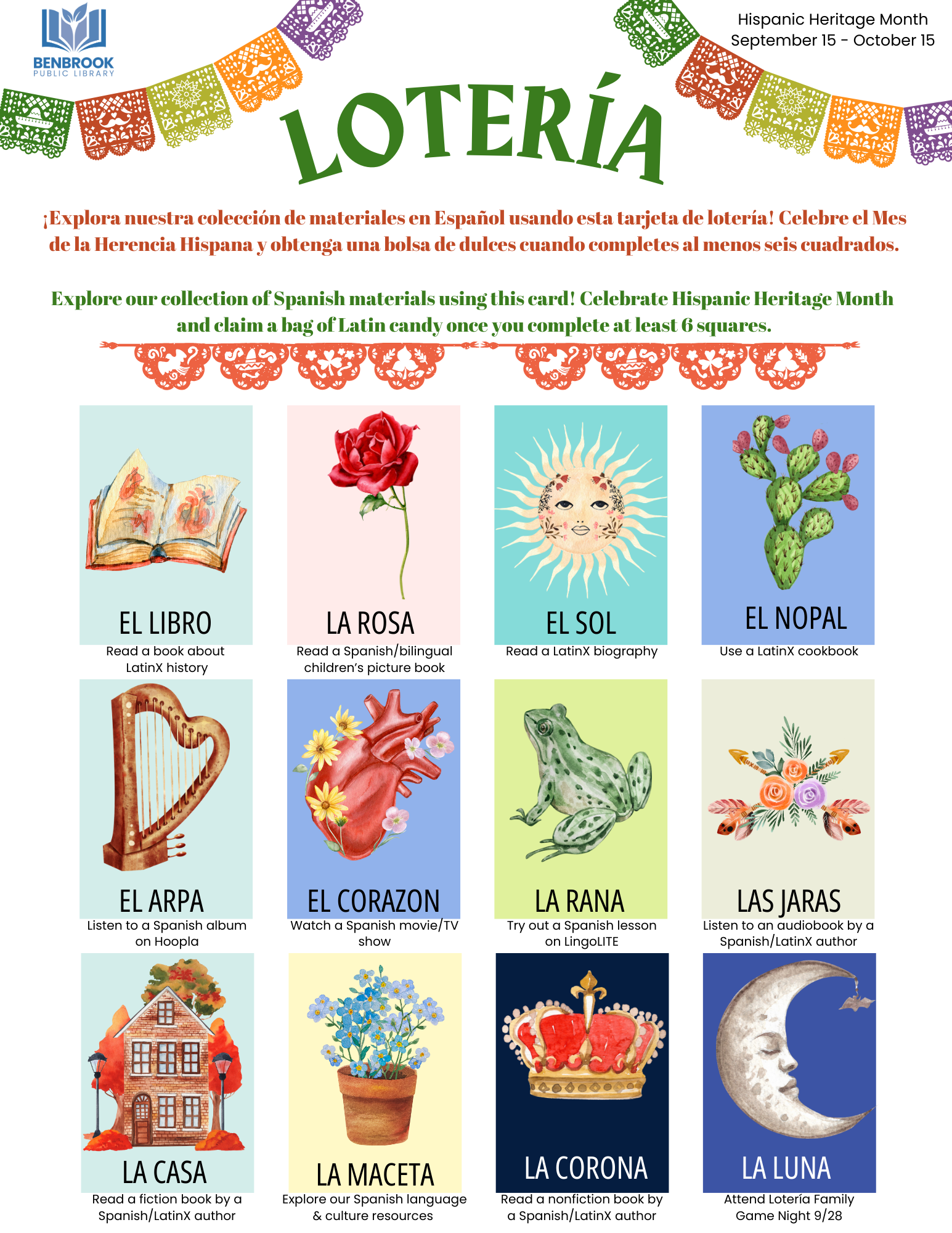 Todo el mes estaremos jugando el clásico juego hispano de Lotería. Esto le permitirá aprender más sobre nuestra biblioteca y también sobre esta hermosa cultura.