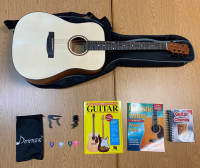 3 books, 1 acoustic guitar, and 4 accessories in a portable carry bag